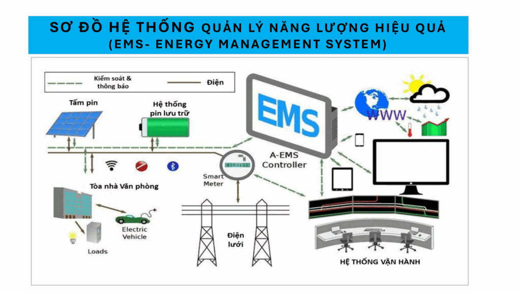 - Điều khiển thông minh & tự động – A-EMS Controller đưa ra quyết định đóng/mở tải, sạc/xả pin hoặc mua/bán điện dựa trên thuật toán.