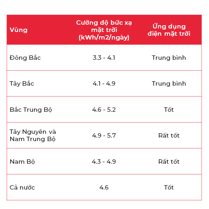 Việt Nam nằm trong khu vực nhiệt đới gió mùa, với trung bình 2.000 – 2.600 giờ nắng mỗi năm. Đặc biệt, khu vực miền Nam và miền Trung có cường độ bức xạ mặt trời cao, rất phù hợp để khai thác điện mặt trời áp mái và điện mặt trời sử dụng trực tiếp.